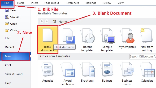 Cara menggunakan Microsoft word 2010 dimulai dengan membuka file dokumennya, yaitu dengan klik Start >>> All Programs >> Microsoft Office >> Microsoft Word. Atau, bisa juga dengan langsung klik icon dari Microsoft word 2010 yang ada di desktop dengan double klik (klik icon-nya dua kali). Setelah muncul jendela kerja Microsoft Word 2010, untuk membuat dokumen baru, langkahnya adalah sebagai berikut;